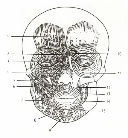 1: čelní sval, 2: štíhlý sval nosní, 3: kruhový sval oční, 4: zdvihač horního rtu a nosního křídla, 5: malý sval lícní, 6: velký sval lícní, 7: smíchový sval, 8: stahovač ústního koutku, 9: sval bradový, 10: svrašťovač obočí